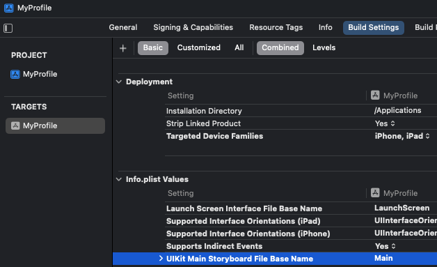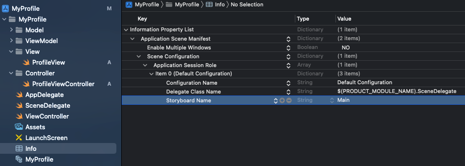 - 'Info.plist Values'에서 Setting에 'UIKit Main Storyboard File Base Name'이 설정되어 있는 것을 확인하고, 삭제한다.
