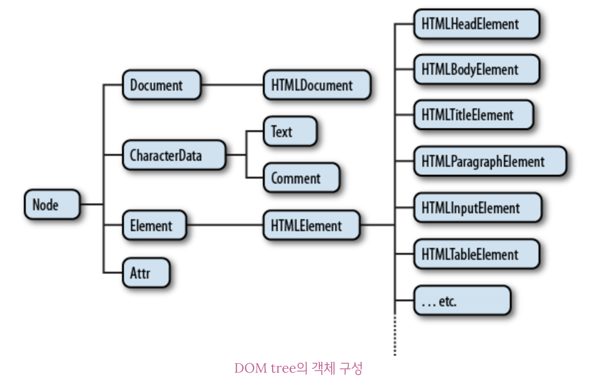 DOM에서 모든 요소, 어트리뷰트, 텍스트는 하나의 객체이며 Document 객체의 자식이다. 요소의 중첩관계는 객체의 트리로 구조화하여 부자관계를 표현한다. DOM tree의 진입점(Entry point)는 document 객체이며 최종점은 요소의 텍스트를 나타내는 객체이다.