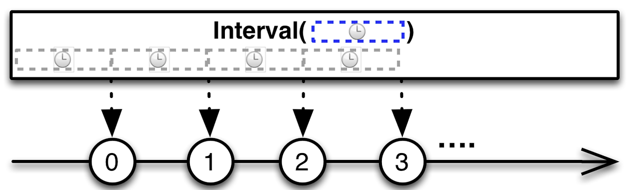 Interval : 지정된 시간 간격으로 정수 시퀀스를 방출하는 Observable을 생성합니다.