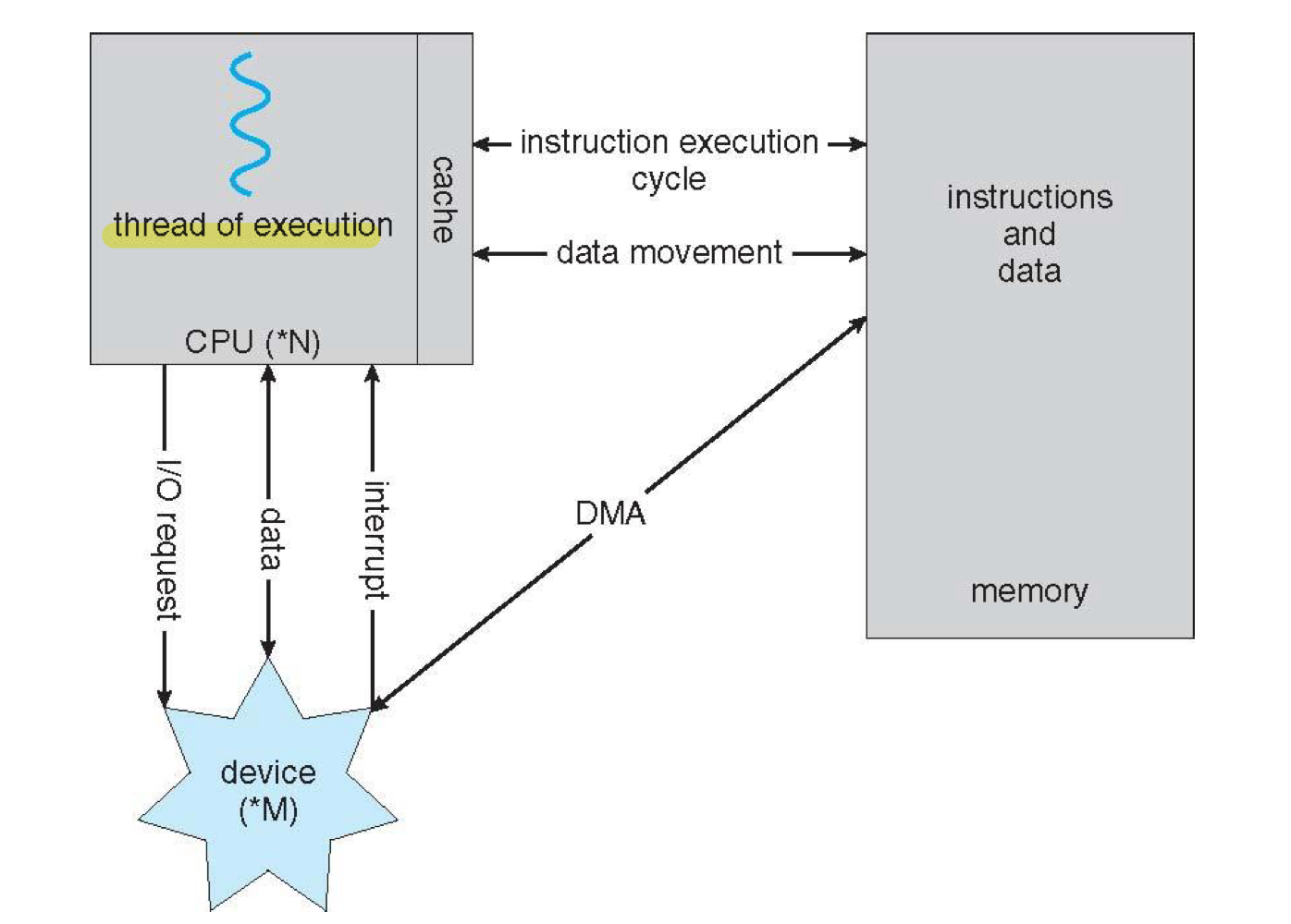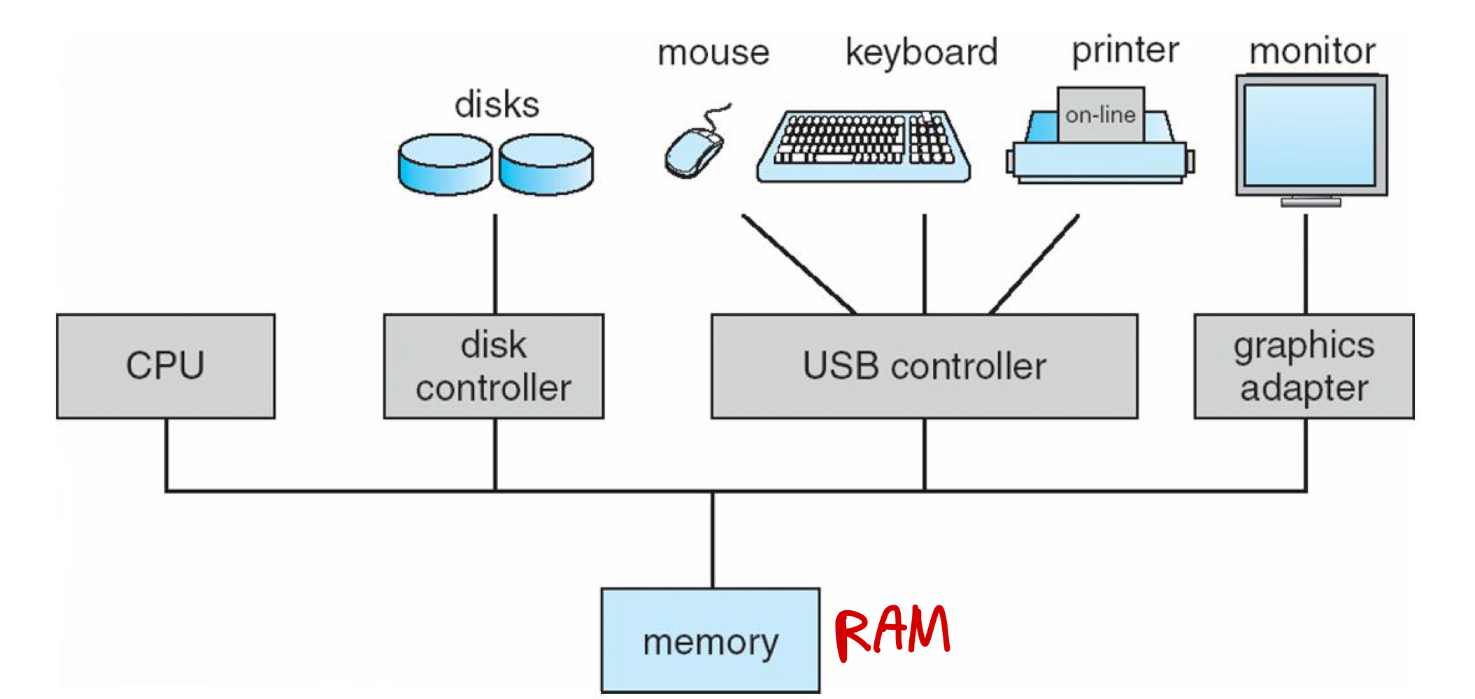 컴퓨터 시스템은 보통 하나 이상의 CPU와 여러 디바이스 컨트롤러(키보드, 디스크 컨트롤러)가 버스라는 공통 통로로 연결된 구조를 가집니다.