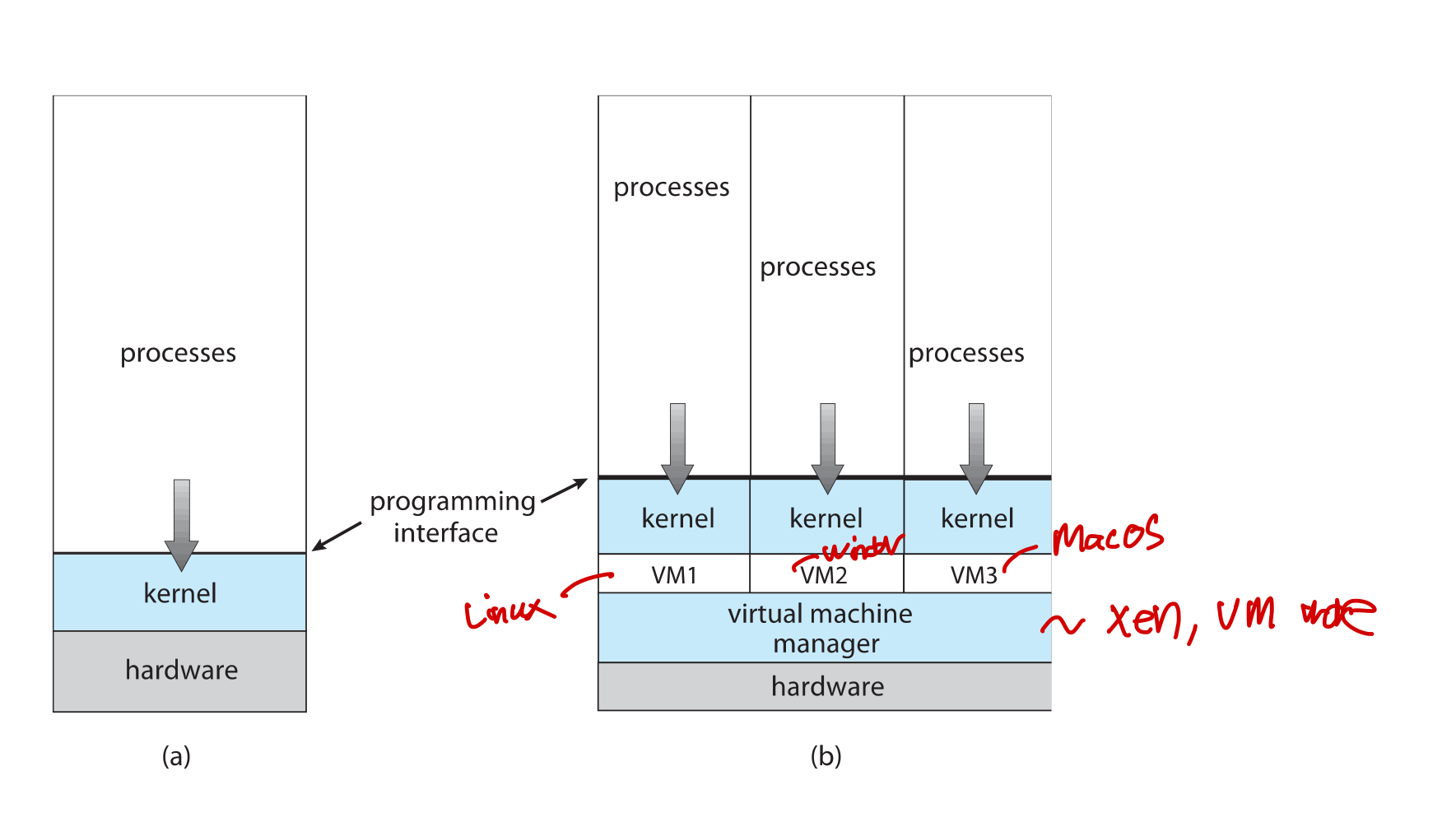 A는 하나의 OS가 동작하는 그림이며, B는 Virtual machines를 이용해 여러 OS를 VM 위에서 돌아가게 만든 모습입니다.