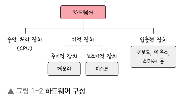 컴퓨터의 물리적 구성에는 CPU(중앙처리 장치), 메모리나 하드 디스크 드라이버 같은 기억 장치, 키보드나 마우스 같은 입출력 장치 등이 있습니다. 이러한 구성 중 하나라도 없으면 컴퓨터는 동작하지 않습니다.