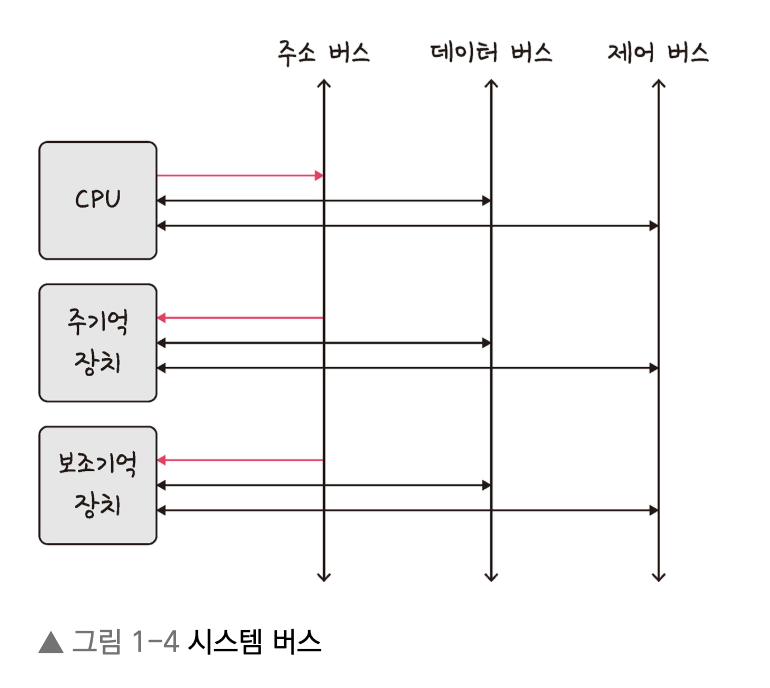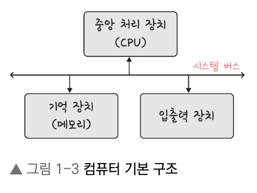 위에서 공부한 CPU, 기억 장치, 입출력 장치가 컴퓨터를 구성하는 기본 구조입니다. 그리고 이들 간 데이터 및 명령어 전달은 시스템 버스가 담당합니다.