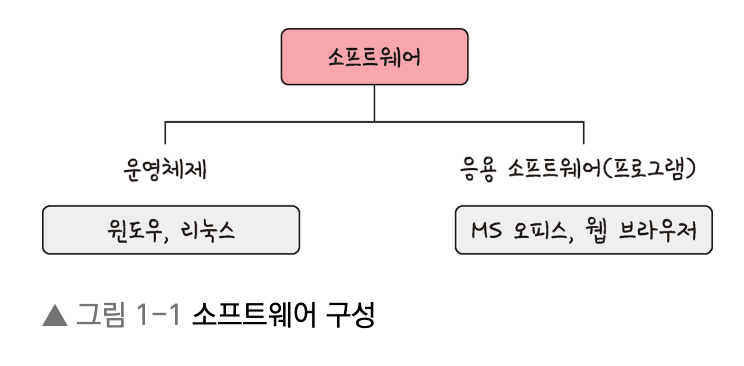 컴퓨터 시스템은 크게 소프트웨어와 하드웨어로 구성됩니다. 먼저 소프트웨어는 운영체제와 응용 소프트웨어(프로그램)로 구분됩니다.