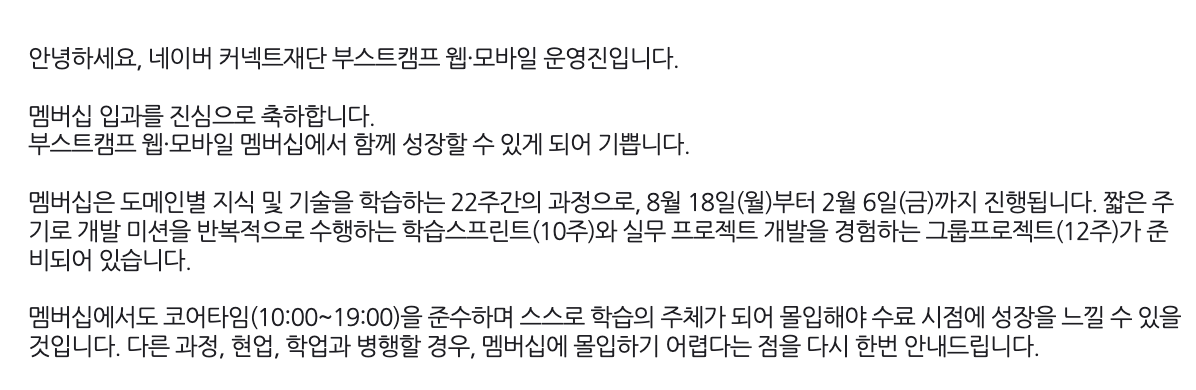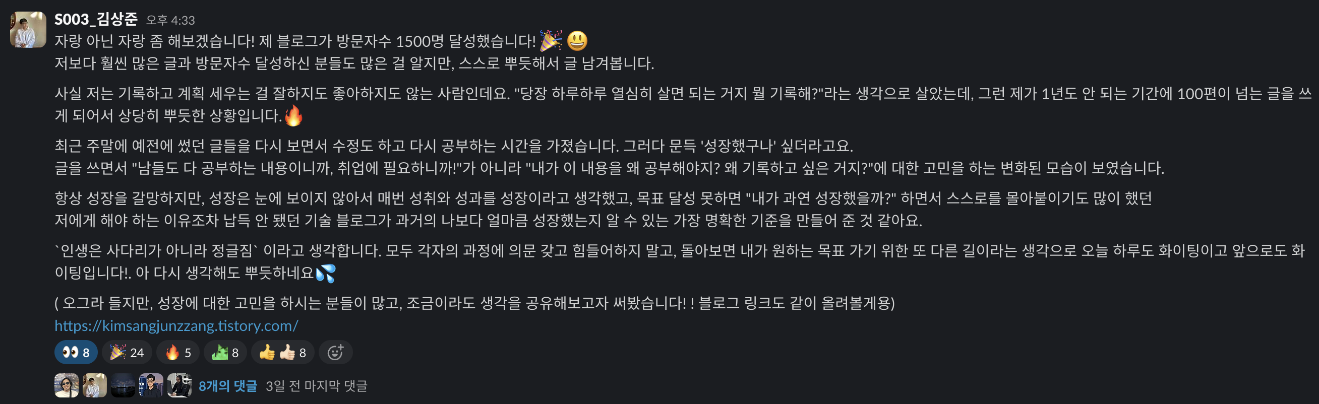 정말 많은 것을 배울 수 있던 시간이었고, 정말 많은 변화를 가져가 보려고 스스로를 계속 바꿔봤던 소중한 시간이었습니다. 제가 오그라들거나 공개적으로 어떠한 말을 잘하는 성격은 아니지만, 제가 부스트캠프 Slack에 남겼던 말을 공유해 봅니다.