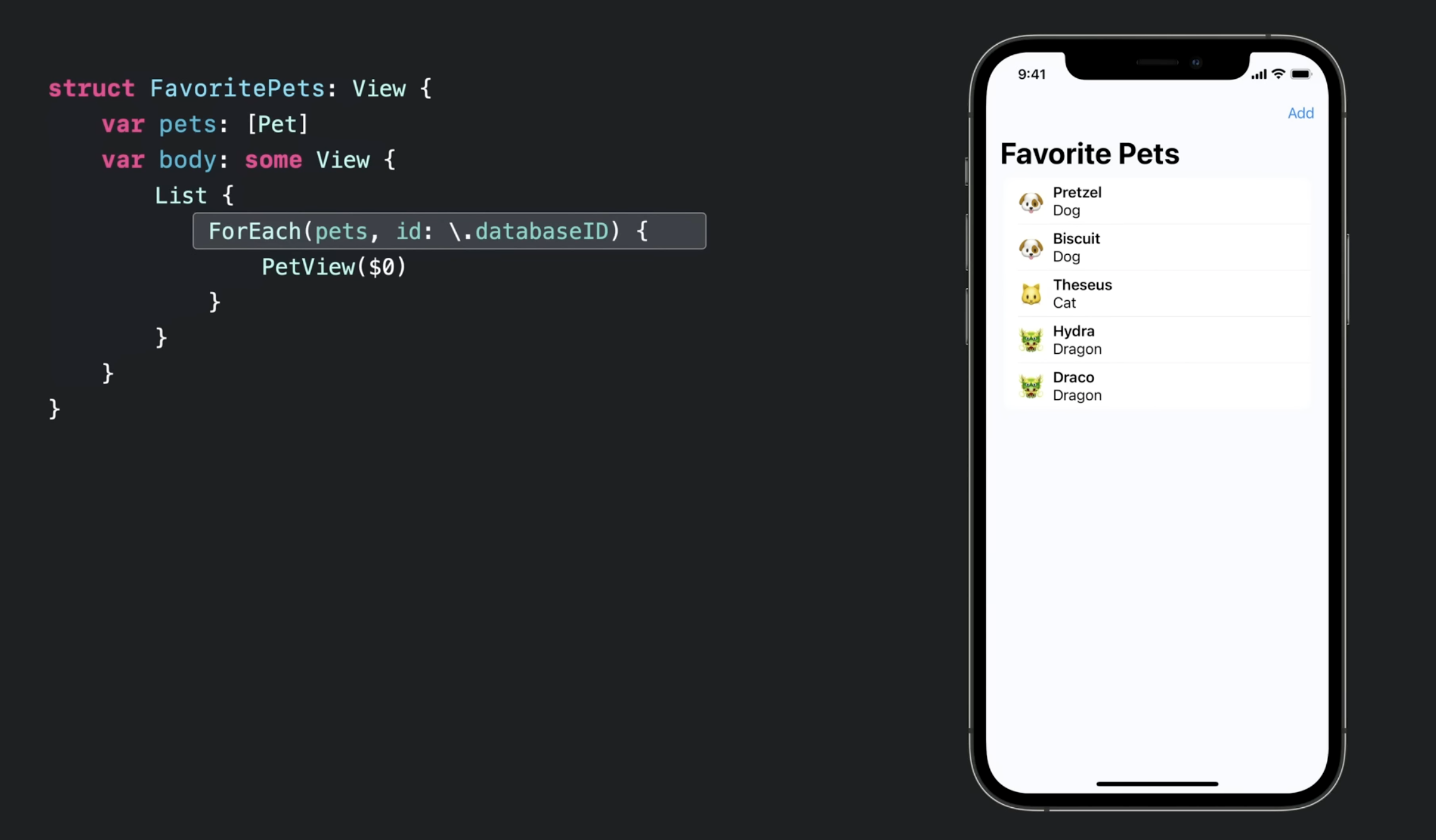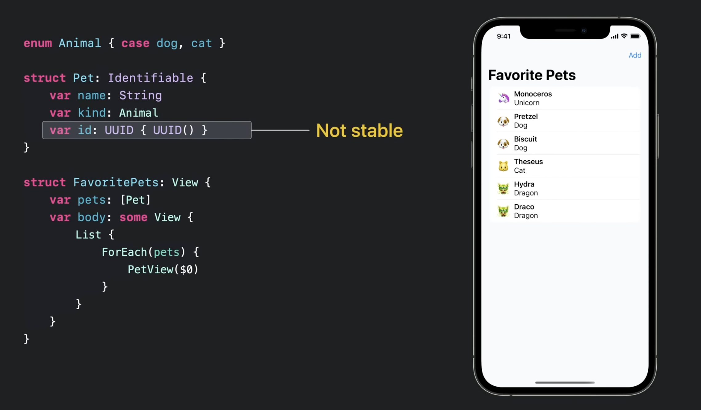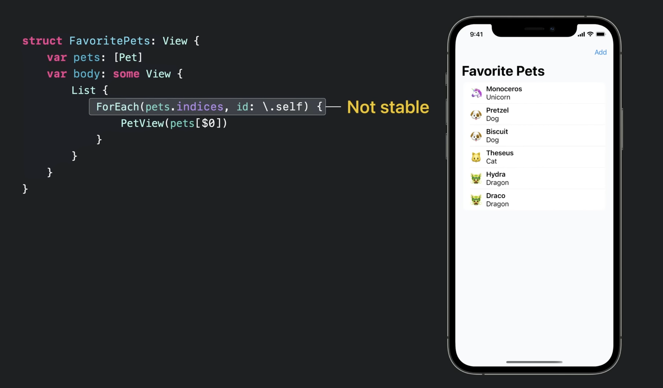 이러한 방식을 사용하게 되면, 배열의 값이 변경될 때 전체 View의 id가 변경됩니다. 그리고 이에 대한 결과로 만약 첫 번째 Pet을 추가, 삭제하면, 뒤에 오는 Cell의 identity가 바뀌어 전체 View를 새로고침 하게 되고, 더 나아간다면, 인덱스를 처리하는 데 있어 인위적인 에러의 가능성 역시 존재하게 됩니다.