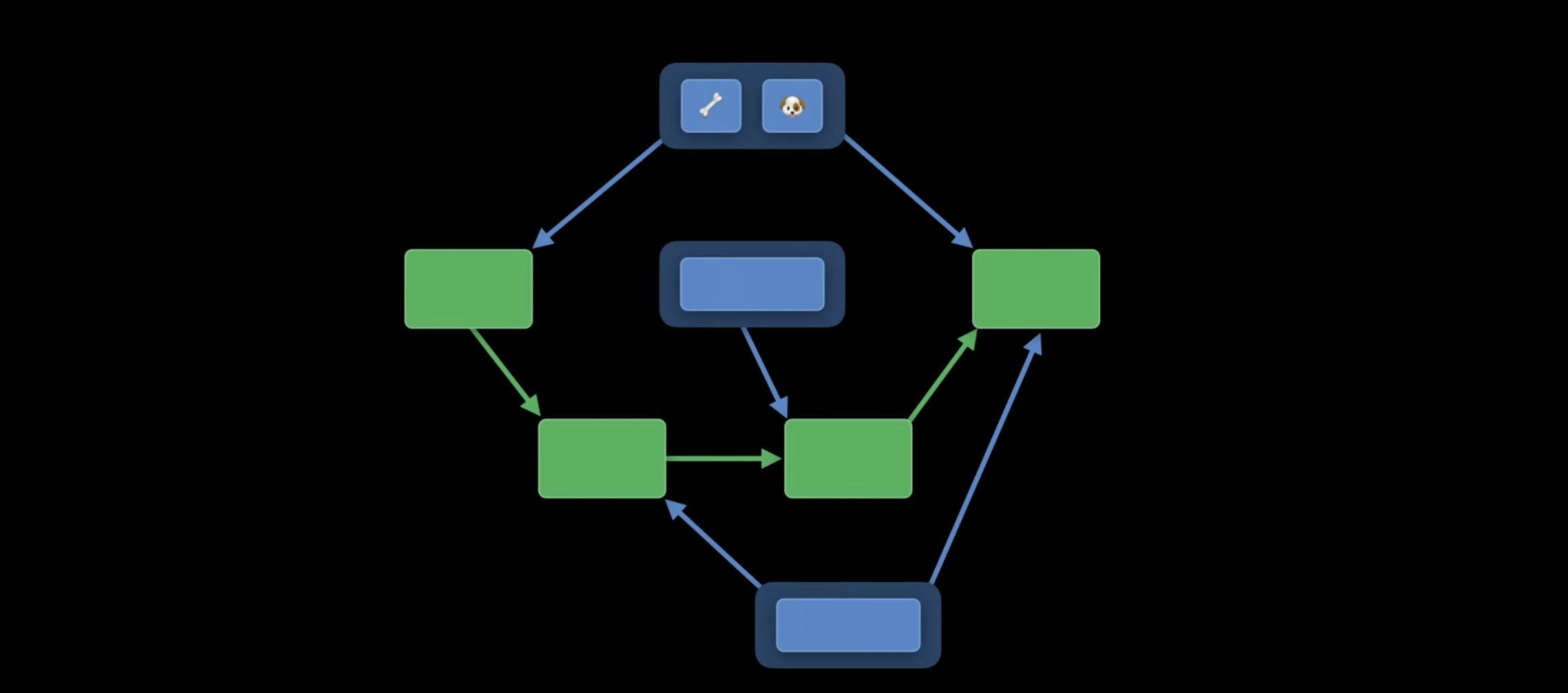그리고 상태나 데이터가 다른 여러 View에서 동시에 참조될 수도 있습니다. 예를 들어, 자식 View 중에 하나도 Dog에 의존할 수 있고, 다른 의존성 집합에도 의존할 수 있는 것이죠. 현재 제일 상단에 있는 View와 제일 하단에 있는 View가 같은 의존성 집합에 의존하고 있는 것처럼 말입니다.