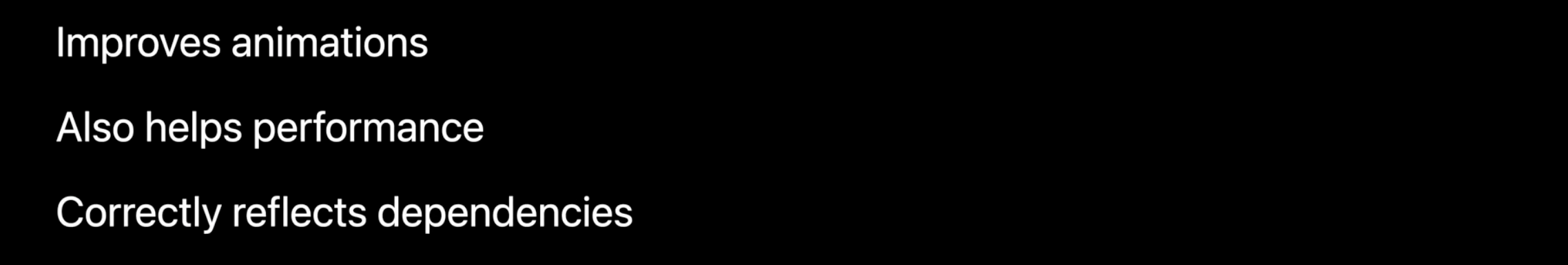 이 형태를 우리는 의존성 그래프라고 부릅니다. 이러한 형태는 SwiftUI가 새로운 body가 필요한 View만 효율적으로 업데이트할 수 있게 해 주기 때문에 핵심이 되는 개념입니다.