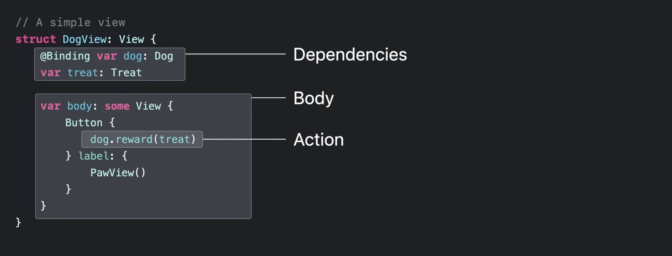 이러한 property들을 우리는 View의 의존성이라고 부르는데요. 의존성이 변경되면, body는 새롭게 만들어 지며, Button과 같은 Action은 View의 의존성에 대한 변경을 트리거합니다.